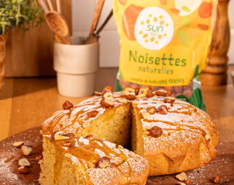 Une fois votre gâteaux cuit et sortit du four, ajoutez les 15g restants de noisettes en toppings sur votre gâteau entière sou concassées pour une touche croquante.