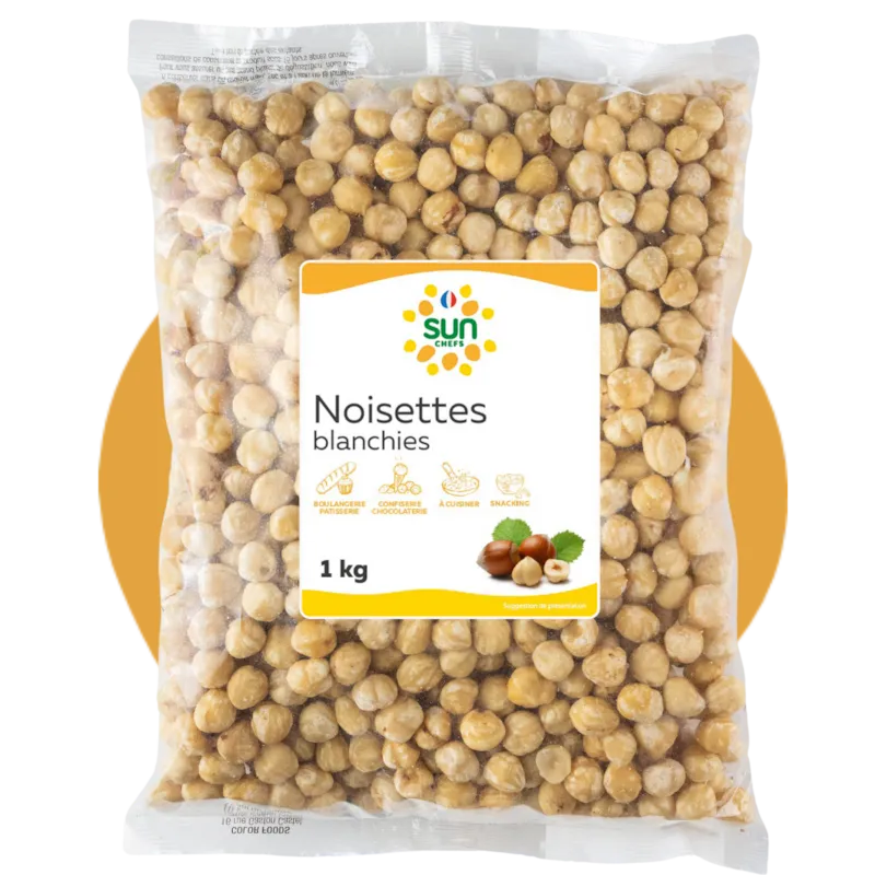 Les noisettes blanchies sont idéales pour les professionnels qui recherchent une présentation élégante et une saveur douce. Blanchies pour éliminer leur peau, elles sont parfaites pour les pâtisseries fines, les sauces crémeuses, et les décorations.