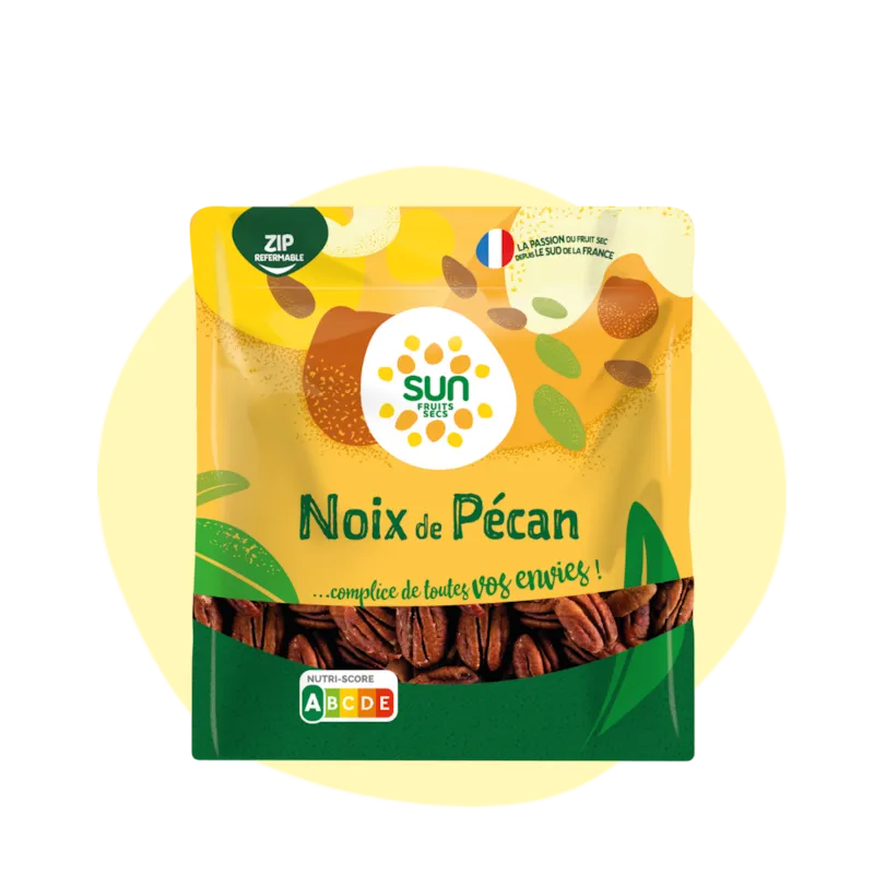 La gamme AU NATUREL, SUN est complice de toutes vos envies ! Découvrez nos fruits à coque dans leur état brut ! Aussi bien à grignoter quà cuisiner ! La noix de pécan est appréciée pour sa densité nutritionnelle et contribue