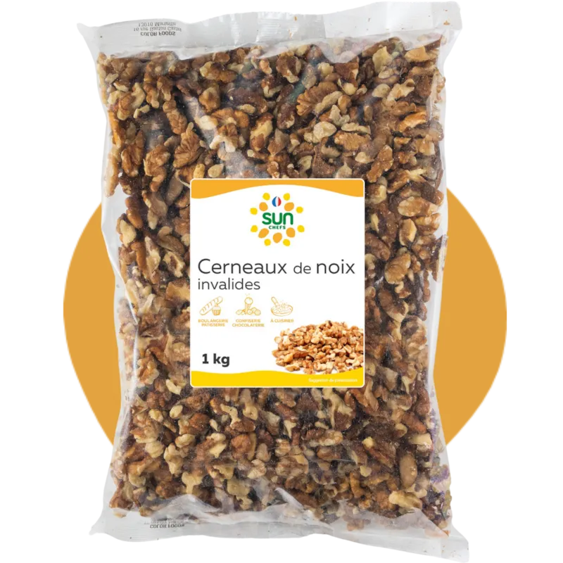 Le cerneau de noix invalide est un produit économique qui permet de réduire les coûts tout en offrant une utilisation pratique pour des préparations culinaires variées. Bien que ne répondant pas aux standards de qualité les plus élevés, il reste un choix valable pour les applications où une présentation parfaite n’est pas essentielle, comme dans les préparations de sauces, les mélanges de fruits secs, ou les produits de boulangerie. Les cerneaux de noix, avec leur saveur riche et leur texture croquante, sont parfaits pour une collation nutritive et énergisante, offrant une abondance de bienfaits naturels. Les oléagineux sont adaptés pour une collation ou encore pour être intégrés à vos recettes préférées sucrées comme salées. Ils se consomment aussi bien au naturel, crus mais se prêtent aussi très bien à la torréfaction au four ou dans une poêle ou encore pour en faire une pate à tartiner. Notre offre Sun Chefs s’adresse aux professionnels de la restauration avec une équipe dédiée. C’est en interrogeant des chefs et en passant du temps avec vous en cuisine, que nous avons pu mieux comprendre vos challenges du quotidien et imaginer une offre sur-mesure !Texture, parfums, décoration, nous vous aidons à sublimer vos recettes en révélant tout le potentiel des fruits secs.Des recettes inspirantes, une large gamme de produits, des conseils d’utilisation, c’est dans cet univers que la marque Sun Chefs vous invite ! - Cerneaux de noix - Calibre Invalide - 6x1kg - Sun Chefs