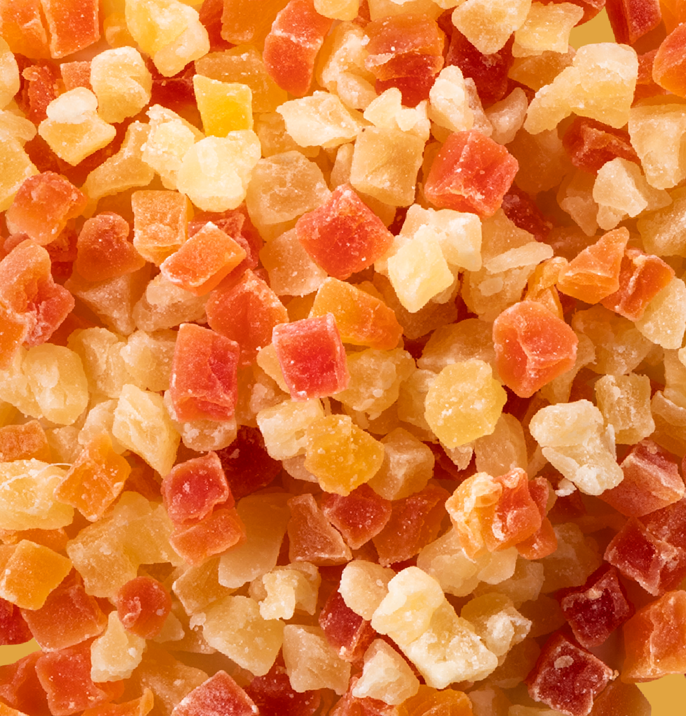 Cubes d'ananas séchés et sucrés (ananas, sucre, acidifiant: E330, conservateurs : E220, E223 (SULFITES)), cubes de papayes séchées et sucrées (papaye, sucre, acidifiant: E330, conservateurs : E220, E223 (SULFITES)).