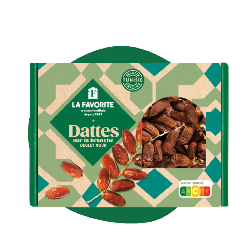 La Favorite vous propose un coffret unique de dattes naturelles branchées. A maturité, les branches des régimes de dattes sont coupées et conditionnées directement dans les grands coffrets, nous avons créé ce coffret unique qui permet de conserver la branche dans son intégrité et de préserver la qualité du produit.Issues des oasis de Tunisie, les dattes de la variété Deglet Nour sont les plus consommées en France : leur chair savoureuse et mielleuse caractéristique ainsi que leur couleur ambrée en font une vraie gourmandise. Retrouvez des fruits séchés cultivés, récoltés et sélectionnés dans le respect de la tradition dans notre gamme SELECTION TRADITIONNELLE ! Les dattes Deglet Nour sont reconnues pour leur douceur naturelle et leur texture fondante. Cultivées dans les oasis ensoleillées du Maghreb, ces dattes sont riches en fibres et minéraux essentiels, parfaites pour une collation énergétique et un boost de bien-être. En ajoutant les fruits sechés dans votre alimentation, vous pouvez profiter de leur douceur naturelle, de leur texture agréable et de leurs bienfaits pour la santé tout au long de la journée. Ils sont parfaits pour une collation rapide et énergisante grâce à leurs sucres naturels qui se diffusent rapidement ou encore en accompagnement d'une planche de fromage. Les saveurs de La Favorite sont héritées du savoir-faire des cultures de fruits provenant de terroirs rigoureusement sélectionnés.Maison familiale depuis 1947, La Favorite s'est installée aux portes de la Méditerranée, au plus proche des cultures et de ses partenaires.Notre histoire s'est ainsi écrite par l'union d’Hommes, de régions et de terre, permettant de vous offrir des fruits gourmands, naturels et sains. Un mélange harmonieux pour un oasis de plaisir d'hier à aujourd'hui ! - Dattes branchées Deglet Nour séchées 24X500G Origine Tunisie - 100% Naturelles - Idéales pour Snacking et Recettes - Fondantes et Aromatiques - LA FAVORITE