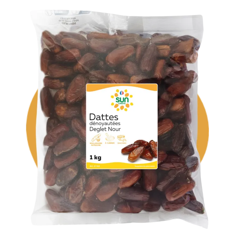 Les dattes dénoyautées sont un choix pratique pour les professionnels recherchant un produit prêt à l'emploi. Ces dattes, débarrassées de leur noyau, sont idéales pour les pâtisseries, les barres énergétiques, ou comme en-cas. Leur douceur naturelle et leur texture moelleuse en font un ingrédient versatile, offrant une qualité constante et une facilité d'utilisation dans toutes vos préparations culinaires. Les dattes Deglet Nour sont reconnues pour leur douceur naturelle et leur texture fondante. Cultivées dans les oasis ensoleillées du Maghreb, ces dattes sont riches en fibres et minéraux essentiels, parfaites pour une collation énergétique et un boost de bien-être. Les oléagineux sont adaptés pour une collation ou encore pour être intégrés à vos recettes préférées sucrées comme salées. Ils se consomment aussi bien au naturel, crus mais se prêtent aussi très bien à la torréfaction au four ou dans une poêle ou encore pour en faire une pate à tartiner. Notre offre Sun Chefs s’adresse aux professionnels de la restauration avec une équipe dédiée. C’est en interrogeant des chefs et en passant du temps avec vous en cuisine, que nous avons pu mieux comprendre vos challenges du quotidien et imaginer une offre sur-mesure !Texture, parfums, décoration, nous vous aidons à sublimer vos recettes en révélant tout le potentiel des fruits secs.Des recettes inspirantes, une large gamme de produits, des conseils d’utilisation, c’est dans cet univers que la marque Sun Chefs vous invite ! - Dattes dénoyautées - 10x1kg - Sun Chefs