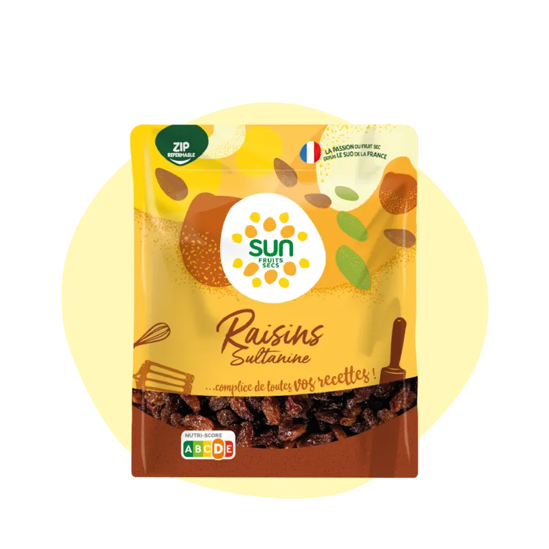 Avec SUN EN CUISINE, nos fruits secs sont vos aides culinaires parfaites pour réaliser toutes vos recettes ! Salées, sucrées, en topping ou en ingrédients principals, sublimez vos préparations en un tour de main ! De couleur brune et naturel les raisins Sultanine ont une saveur douce et sucrée, sans additif. Trés connus, ils sutilisent dans toutes les cuisines du monde ! Pour les pâtisseries, pensez à les faire gonfler dans du thé chaud, cela les rendra plus moelleux. Bon à savoir : profitez de leur apport énergétique en mangeant unepoignée de raisins avant de faire du sport ! En ajoutant les fruits sechés dans votre alimentation, vous pouvez profiter de leur douceur naturelle, de leur texture agréable et de leurs bienfaits pour la santé tout au long de la journée. Ils sont parfaits pour une collation rapide et énergisante grâce à leurs sucres naturels qui se diffusent rapidement ou encore en accompagnement d'une planche de fromage.
