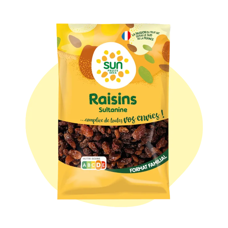 De couleur brune et naturel les raisins Sultanine ont une saveur douce et sucrée, sans additif. Très connus, ils sutilisent dans toutes les cuisines du monde ! Pour les pâtisseries, pensez à les faire gonfler dans du thé chaud, cela les rendra plus moelleux. Bon à savoir : profitez de leur apport énergétique en mangeant une poignée de raisins avant de faire du sport ! En ajoutant les fruits séchés dans votre alimentation, vous pouvez profiter de leur douceur naturelle, de leur texture agréable et de leurs bienfaits pour la santé tout au long de la journée. Ils sont parfaits pour une collation rapide et énergisante grâce à leurs sucres naturels qui se diffusent rapidement ou encore en accompagnement d'une planche de fromage.