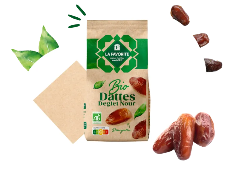 Goûtez à l'excellence des dattes Deglet Nour bio séchées au soleil de la marque La Favorite, un véritable trésor de douceur naturelle.
