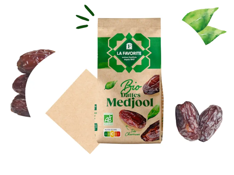 Découvrez les dattes Medjool bio séchées au soleil de la marque La Favorite, un véritable délice sucré et fondant.