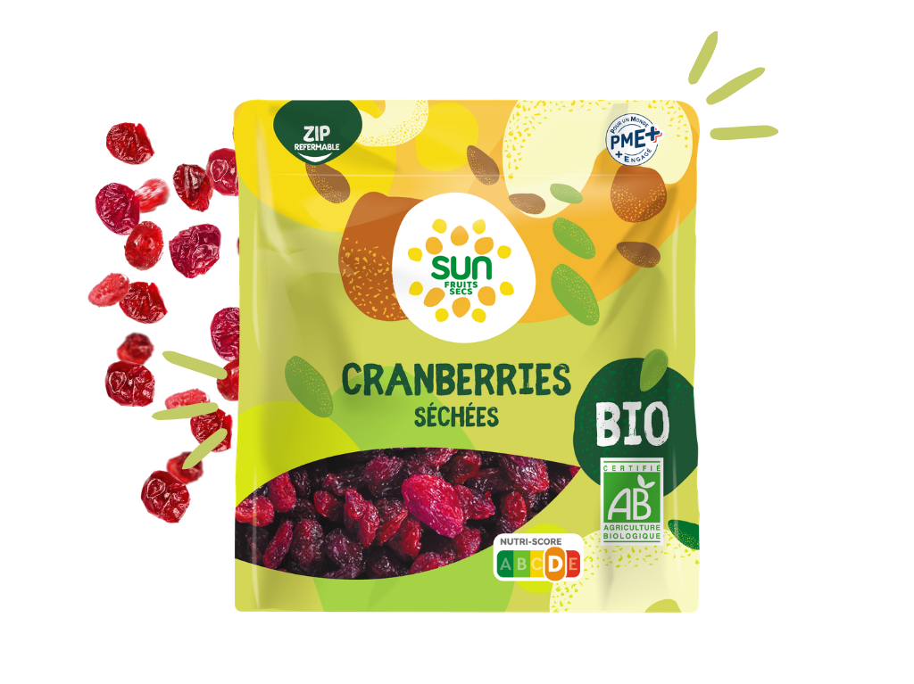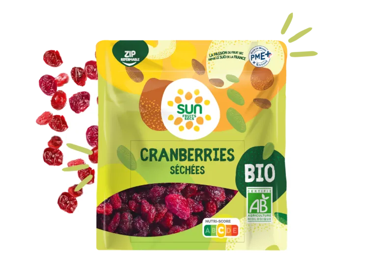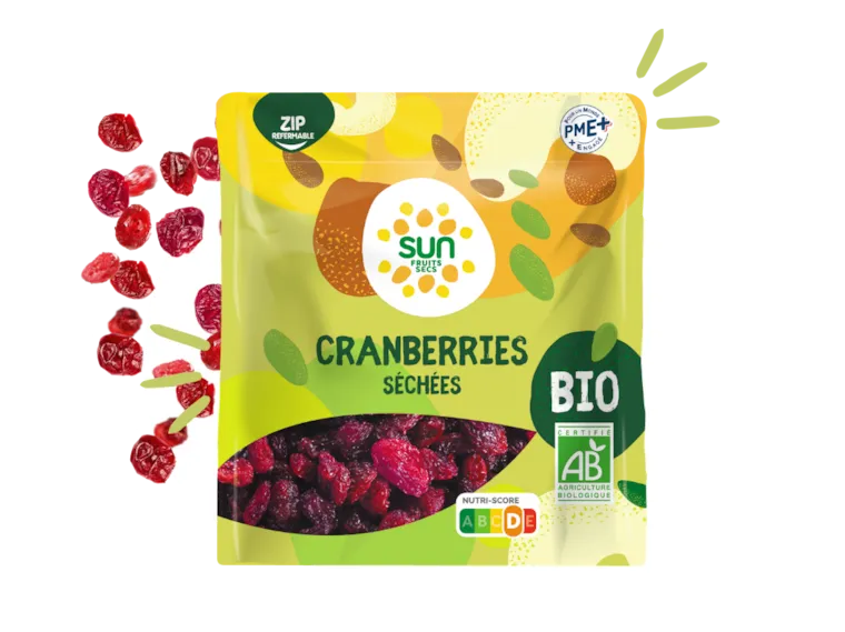 Petites baies, grand caractère ! Nos cranberries bio sont séchées avec soin pour préserver leur texture moelleuse et leur goût naturellement acidulé.