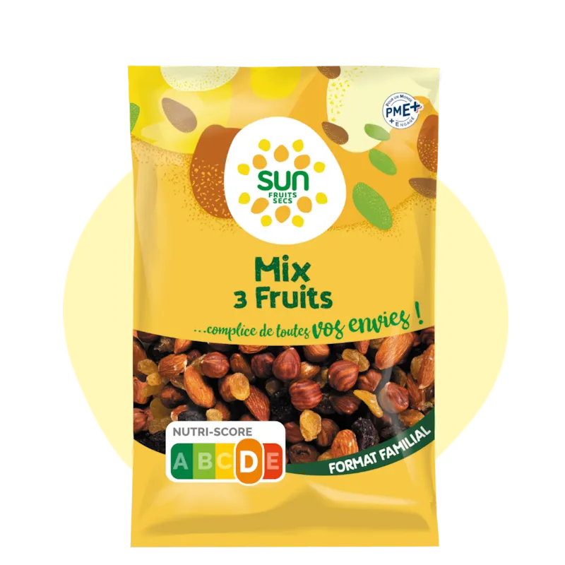 Savourez l'équilibre parfait de notre mélange 3 fruits SUN, associant amandes croquantes, raisins secs succulents et noisettes délicieusement fondantes. Alliance exquise de textures et de saveurs, ce mélange offre une expérience gustative incomparable. Nos amandes, raisins secs et noisettes de qualité supérieure constituent un en-cas énergisant et gourmand, idéal pour satisfaire vos envies de bien-être et de plaisir. Retrouvez des formats XL généreux dans notre gamme SUN EN FAMILLE ! SUN, complice de votre portefeuille, vous assure le bon rapport qualité / prix pour répondre à toutes vos envies ! En incorporant des mix de fruits secs dans votre alimentation quotidienne, vous pouvez profiter de leur saveur délicieuse et de leurs bienfaits pour la santé. En collation saine, dans vos recettes sucrées ou salées ou encore en topping, les fruits secs vous accompagnent ainsi au quotidien. Chez nous, SUN, PME familiale indépendante du Sud de la France, transformer nos graines en pépites de