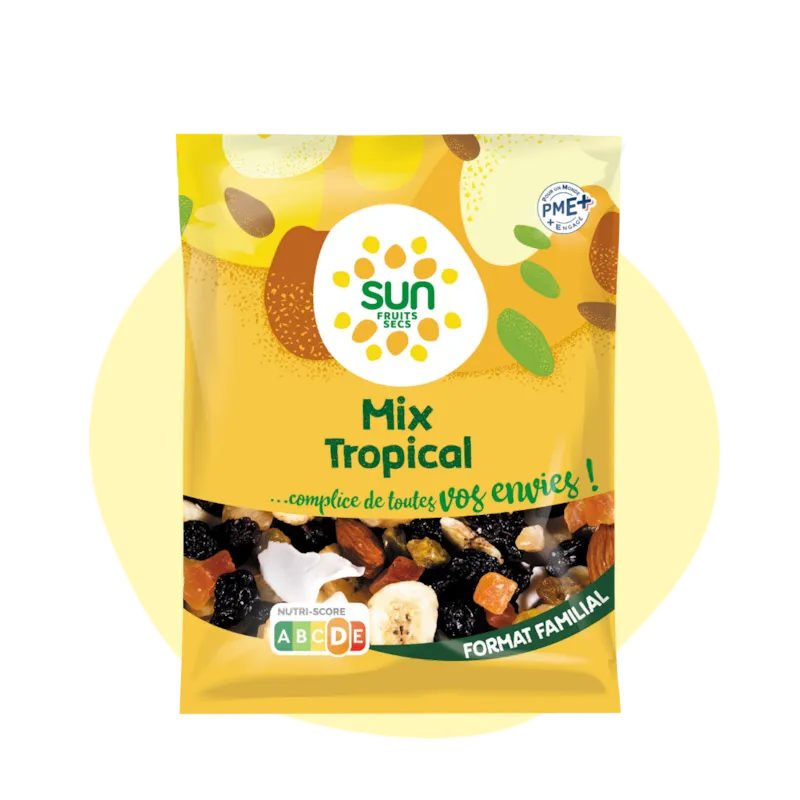 bon rapport qualité / prix pour répondre à toutes vos envies ! En incorporant des mix de fruits secs dans votre alimentation quotidienne, vous pouvez profiter de leur saveur délicieuse et de leurs bienfaits pour la santé. En collation saine, dans vos recettes sucrées ou salées ou encore en topping, les fruits secs vous accompagnent ainsi au quotidien. Chez nous, SUN, PME familiale indépendante du Sud de la France, transformer nos graines en pépites de bonheur, nous en faisons notre métier depuis plus de 40 ans ! Notre secret ? Le juste mélange d'un soleil généreux de la Méditerranée, notre goût des choses simples et notre passion pour les produits naturels...C'est pourquoi nous sélectionnons méticuleusement chaque fruits sec pour partager avec vous la complicité d'un encas sain, le plaisir d'un plat savoureux, la convivialité d'une pause en famille ou entre amis, ou encore le coup de boost d'un moment sportif !