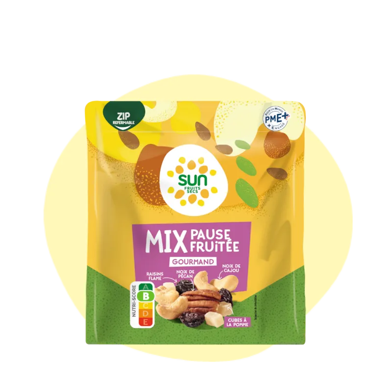 Sun vous propose son mélange "Pause Fruitée" croquant et fondant composé de raisins flame, noix de cajou grillées, noix de pécan et de délicieux cubes à la pomme. Cette explosion de saveurs s'adresse aux plus gourmands d'entre vous pour vos pause saine et gourmande, il apporte une touche fruitée et réconfortante à chaque bouchée.