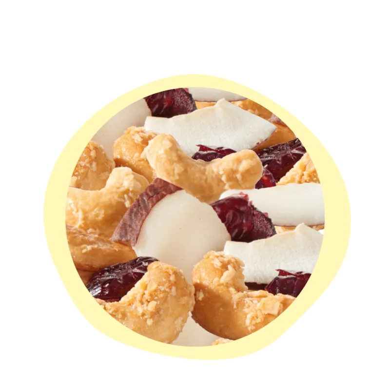Le Mix Coco'Berries est une délicieuse recette, développée dans notre usine de Marseille : des noix de cajou enrobées façon rocher coco, des lamelles de coco croquantes, et des cranberries pour la touche acidulée ! Une explosion de saveurs parfaite pour une pause saine et pleine de peps, à déguster telle quelle ou à intégrer dans un granola maison.
