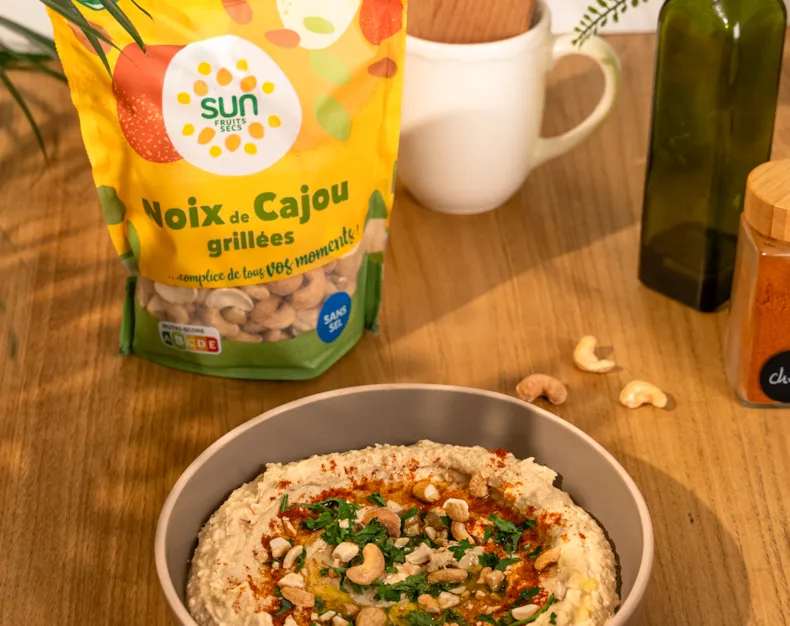 Versez le houmous dans un bol et ajoutez les épices, le reste de l'huile d'olive et parsemez de ciboulettes et de morceaux de cajou pour un coté croquant.