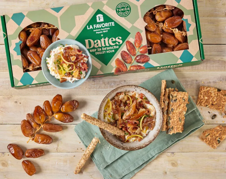 Disposer la pancetta croustillante et les dattes sur le dip au fromage. Assaisonner de flocons de piment et d’un tour de moulin à poivre. Terminer par les amandes effilées et la ciboulette.