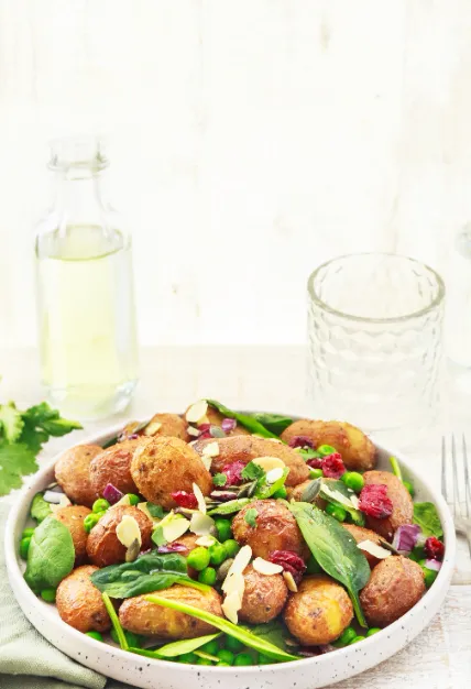 Émincez l’oignon et mélangez-le dans un saladier avec les petits pois, les pommes de terre et les pousses d’épinard. Assaisonnez ensuite avec le jus de citron, le miel, le vinaigre et l’huile. Salez, poivrez et saupoudrez du mix La Régalade ainsi que de persil frais ciselé.