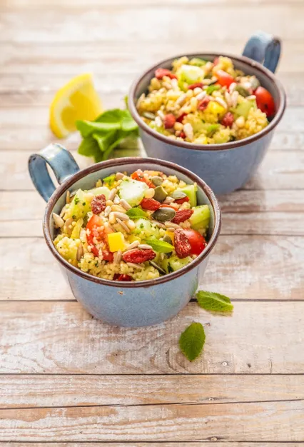 Ciselez finement la menthe. Coupez les tomates en quartiers et le concombre en petits dés. Rincez le demi citron confit, le couper en lamelles, retirez la chair puis coupez l’écorce en petits morceaux. Ajoutez le tout à la semoule. Bien mélanger et mettre 1h au frais.