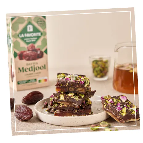 Envie d'un encas sain et gourmand à la fois ? Découvrez notre Dat'lette, une tablette de dattes Medjool au tahini, pistaches torréfiées et pétales de roses couvertes de chocolat noir et d'une pincée de flocons de sel.